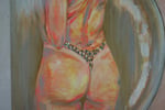 Acrylique sur toile, 30 x 40 pouces (76 x 101,5 cm). Inspirée d’un selfie dans le miroir, cette œuvre représente la forme féminine avec des tons doux et lumineux, mêlant subtile abstraction et formes fluides pour évoquer chaleur et intimité.