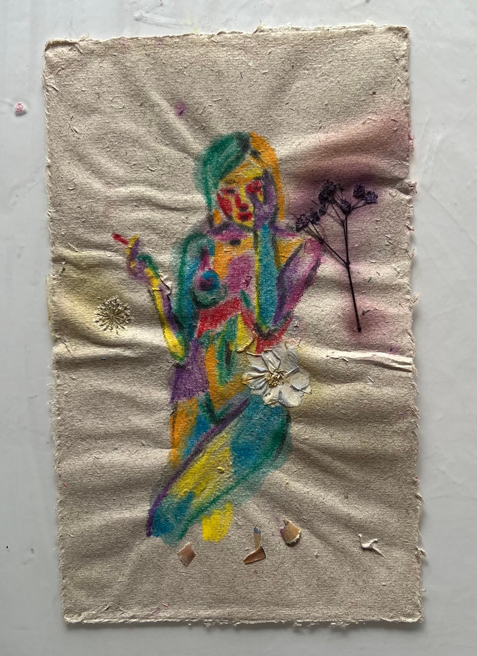 Handmade recycled paper crafted with pencil shavings and dried flowers, painted in watercolor and framed. This piece is a delicate ode to nature, intertwining organic textures with soft pigments to honor what is, perhaps, the most beautiful creation on earth — a woman. Her form, rendered in vibrant, flowing colors, carries both the strength and fragility of nature itself, capturing a sense of freedom, timelessness, and quiet vitality.