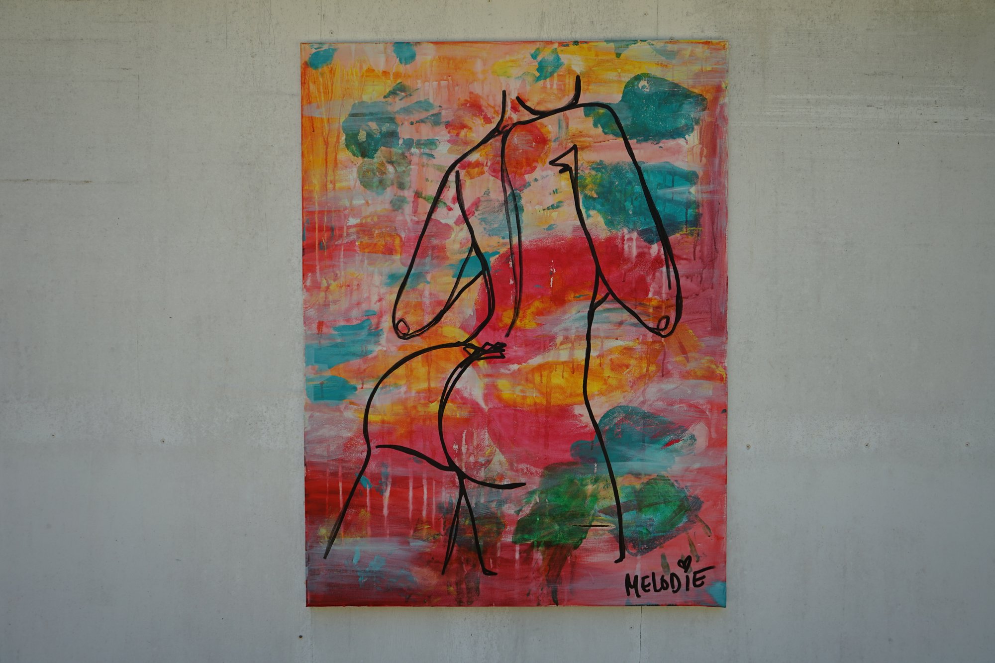 Acrylique sur toile, 30 x 40 pouces (76 x 101,5 cm). Peinte avec le corps de l’artiste comme outil, puis rehaussée d’une silhouette tracée en un seul trait continu, sans interruption. Le fond éclatant et texturé contraste avec le trait noir fluide, fusionnant présence physique et expression abstraite.