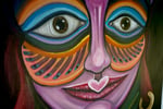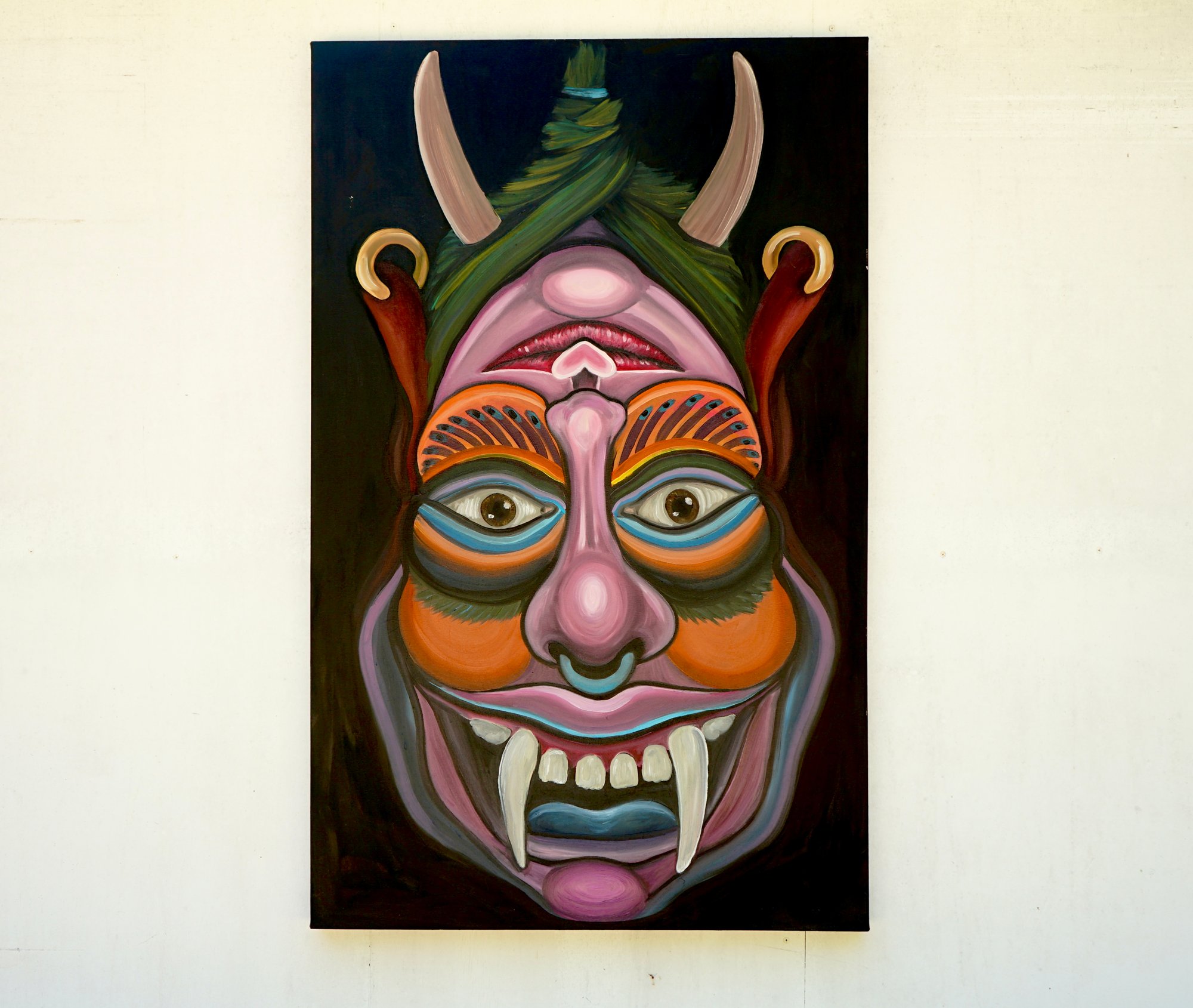 Huile sur toile, 30 x 48 pouces (76 x 122 cm). Une toile réversible offrant deux visions en une : d’un côté, un diable éclatant aux allures de masque; retournée, une femme stylisée. Des couleurs intenses et des formes dynamiques mêlent fantaisie et symbolisme sur un fond noir profond.