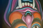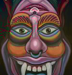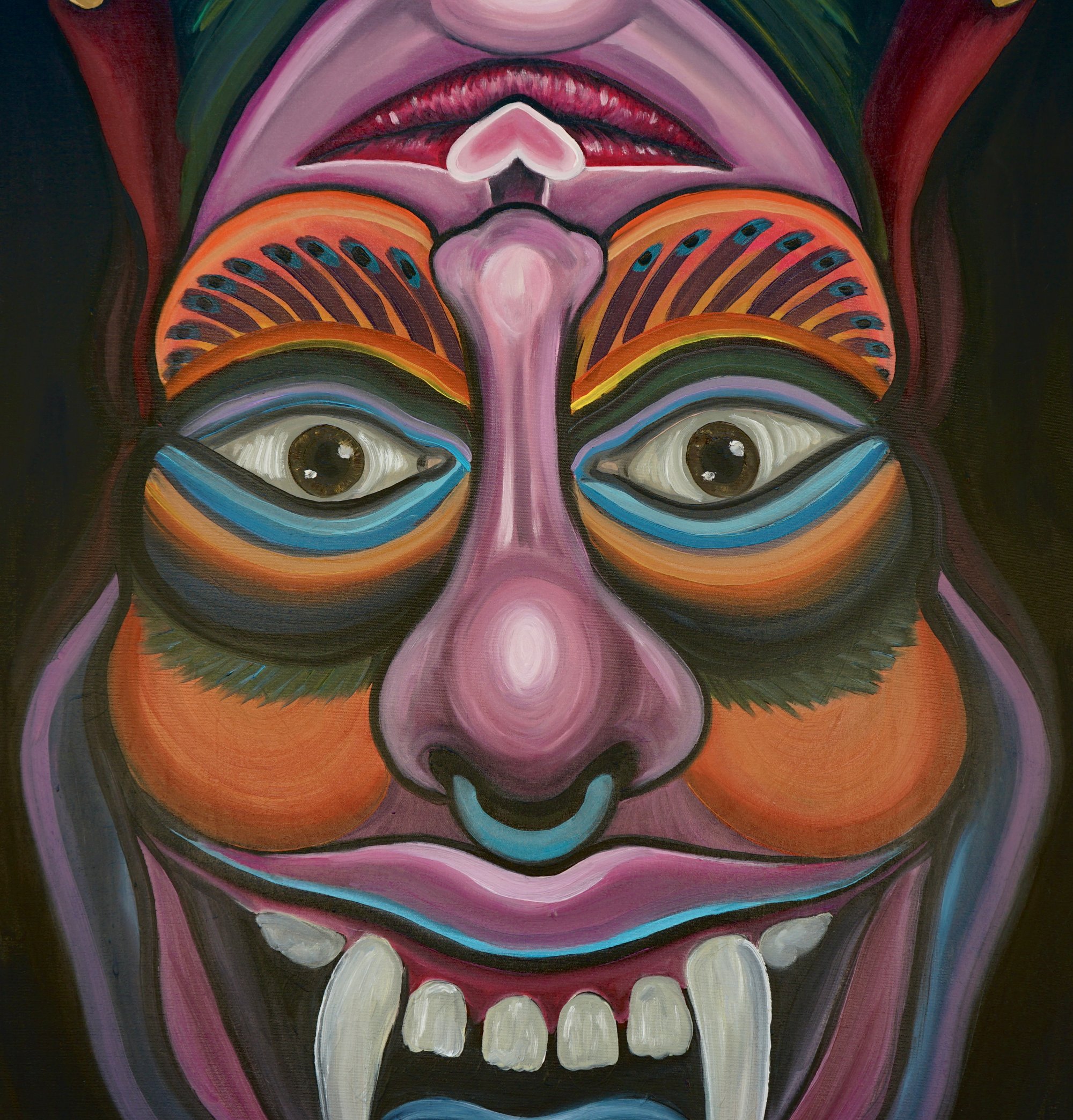 Oil on canvas, 30 x 48 inches (76 x 122 cm). A reversible painting that reveals two visions in one: viewed one way, a vibrant, mask-like devil; flipped, a stylized woman. Bold colors and dynamic shapes blend fantasy and symbolism on a deep black background.