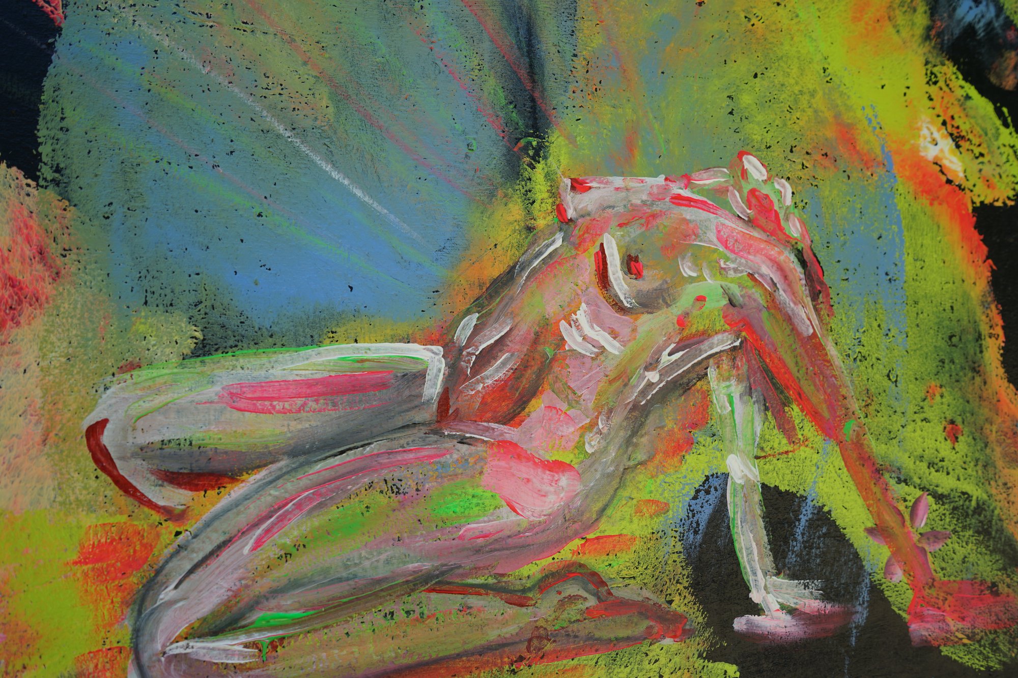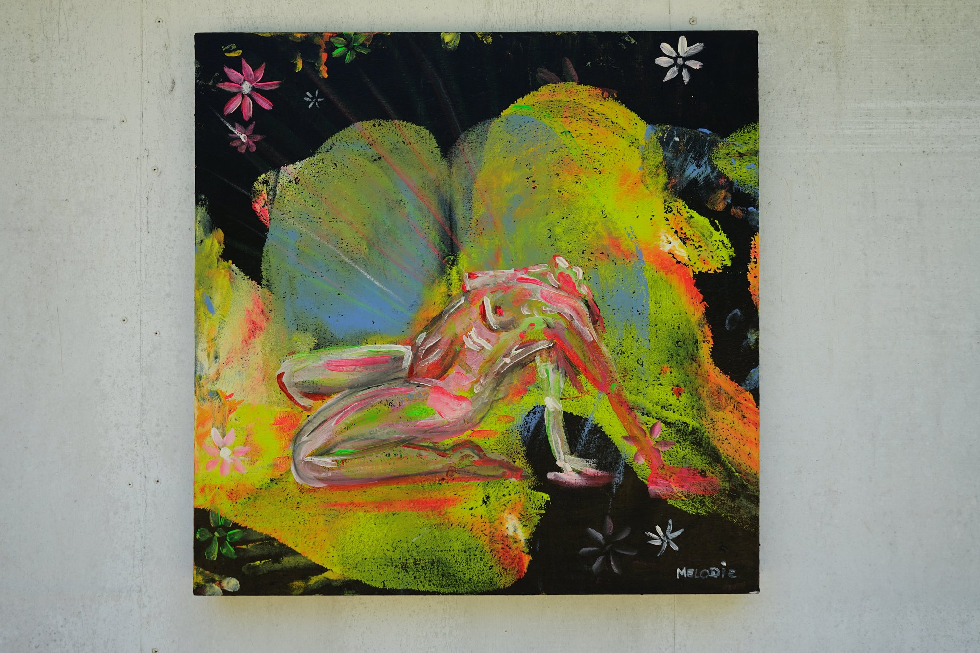 Acrylique sur toile, 24 x 24 pouces (61 x 61 cm). Peinte avec le corps de l’artiste, cette œuvre explose de féminité, une célébration de la reprise de pouvoir, de l’acceptation de sa sensualité et du bien-être dans son corps.