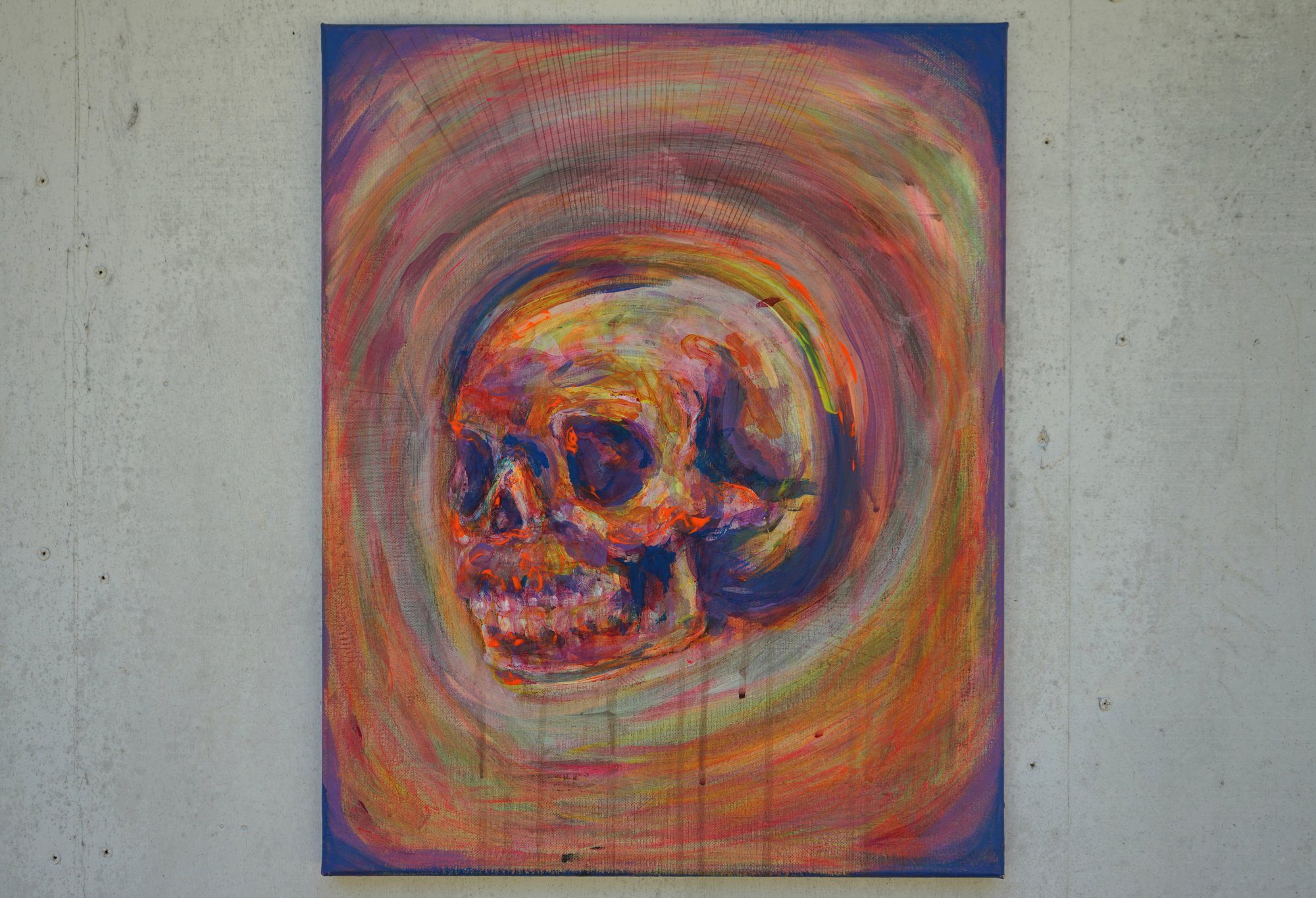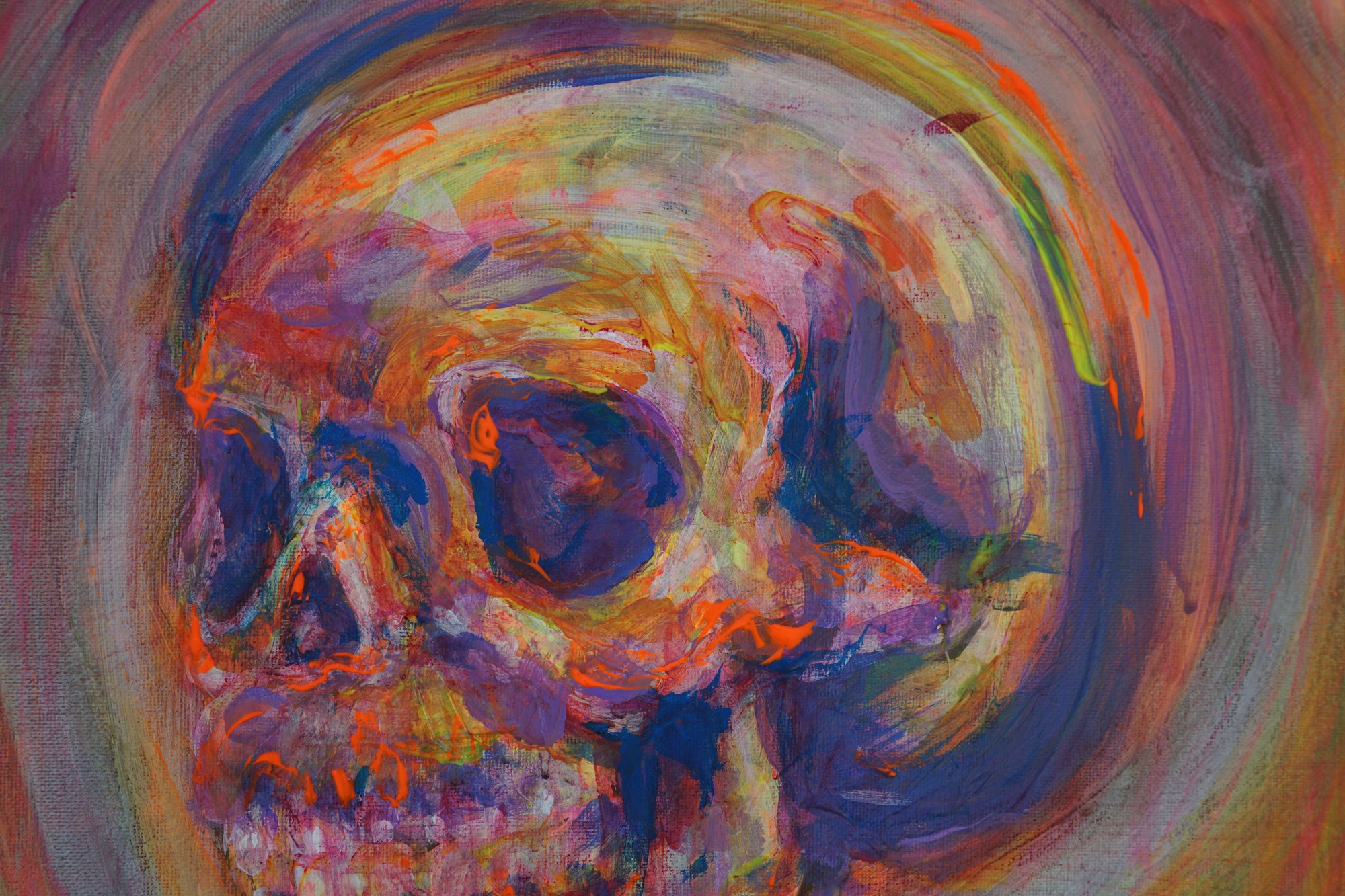 Acrylic on canvas, 16 x 20 inches (41 x 51 cm). The skull represents us, while the swirling colors embody everything happening around us, the chaos, the beauty, and the constant motion of life.