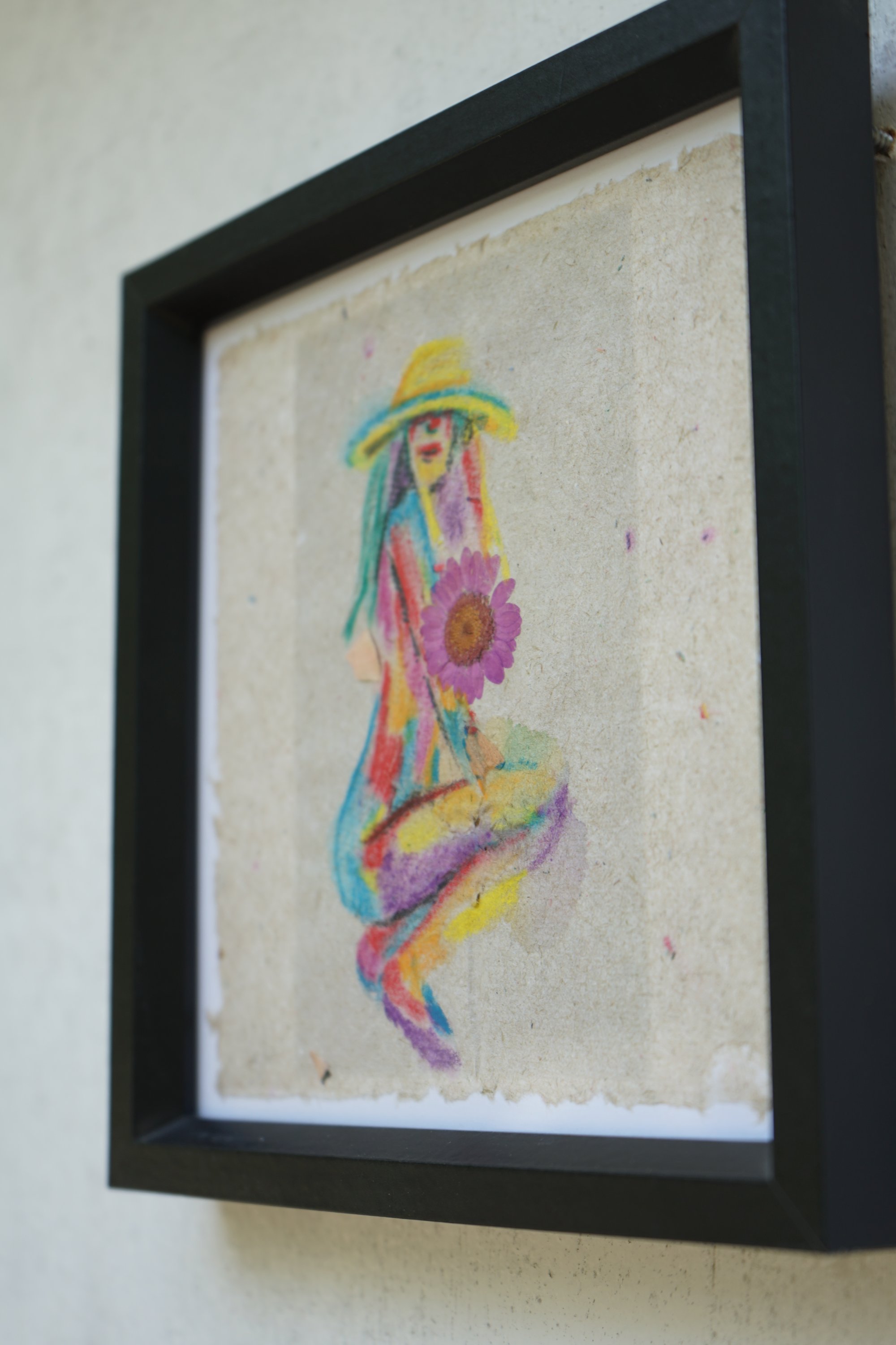 Handmade recycled paper crafted with pencil shavings and dried flowers, painted in watercolor and framed. This piece is a delicate ode to nature, intertwining organic textures with soft pigments to honor what is, perhaps, the most beautiful creation on earth — a woman. Her form, rendered in vibrant, flowing colors, carries both the strength and fragility of nature itself, capturing a sense of freedom, timelessness, and quiet vitality.