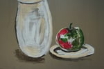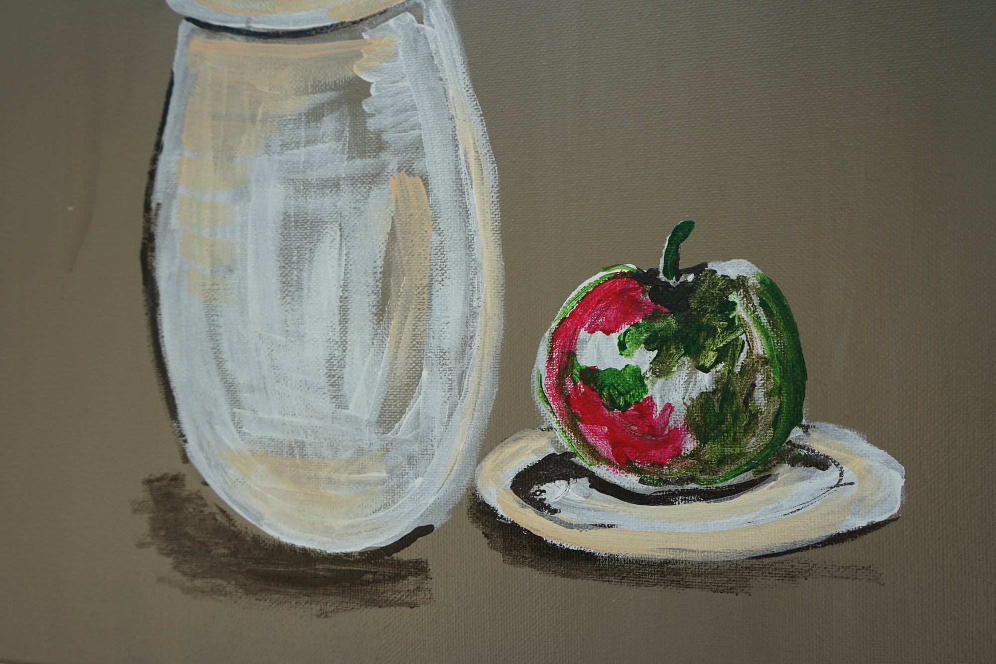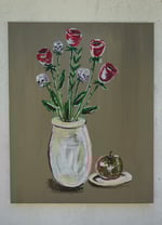 Acrylic on canvas, 16 x 20 inches (41 x 51 cm). A still life with a twist, deep red roses and smaller blooms shaped like skulls stand in a simple vase, accompanied by a single apple. A play between beauty and mortality.