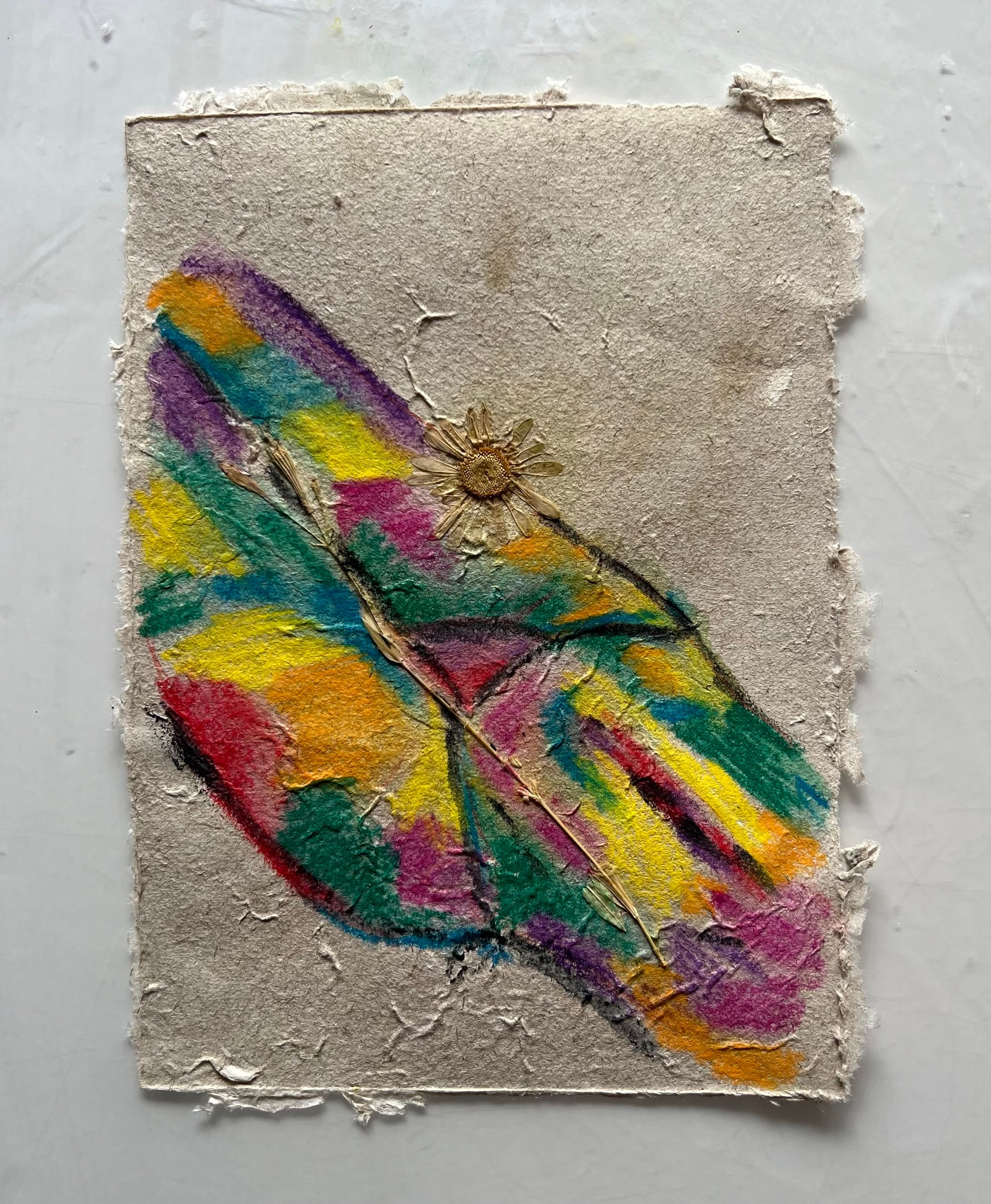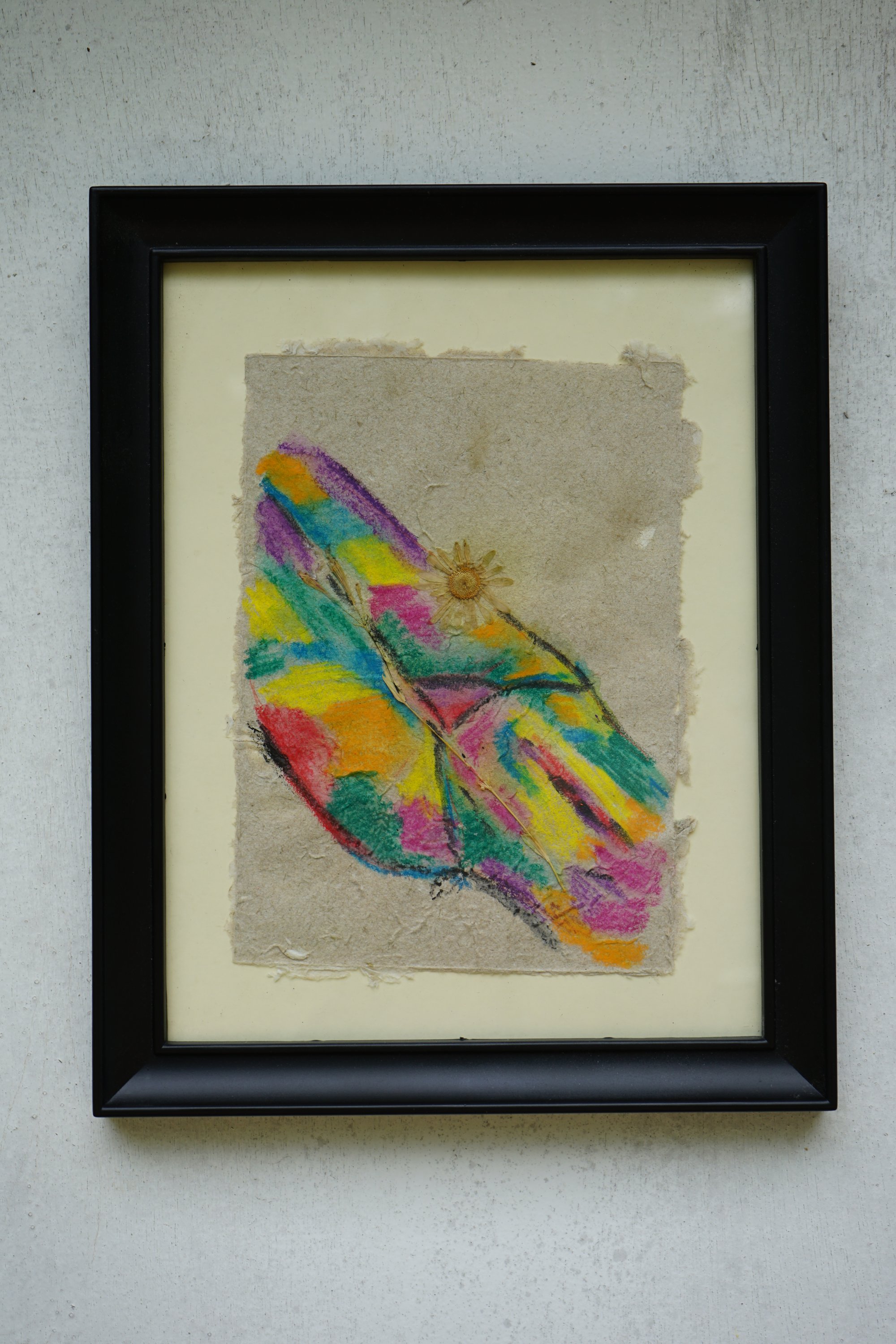 Papier recyclé fait à la main avec retailles de crayons et fleurs séchées, peint à l’aquarelle et encadré. Cette œuvre est une ode délicate à la nature, mêlant textures organiques et pigments doux pour rendre hommage à ce qui est peut-être la plus belle création sur terre — une femme. Sa silhouette, peinte de couleurs vibrantes et fluides, porte à la fois la force et la fragilité de la nature, capturant un sentiment de liberté, d’intemporalité et de vitalité silencieuse.