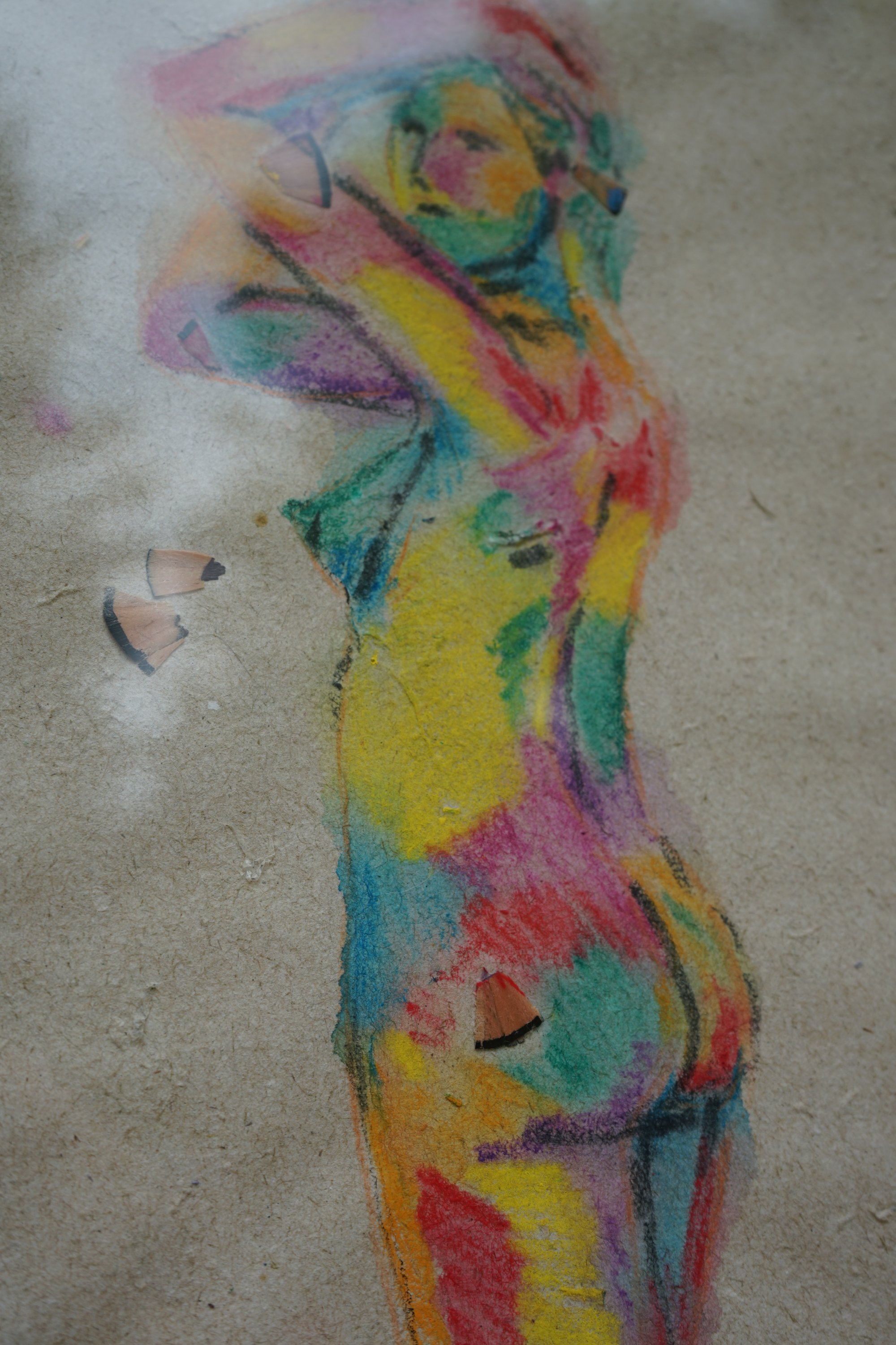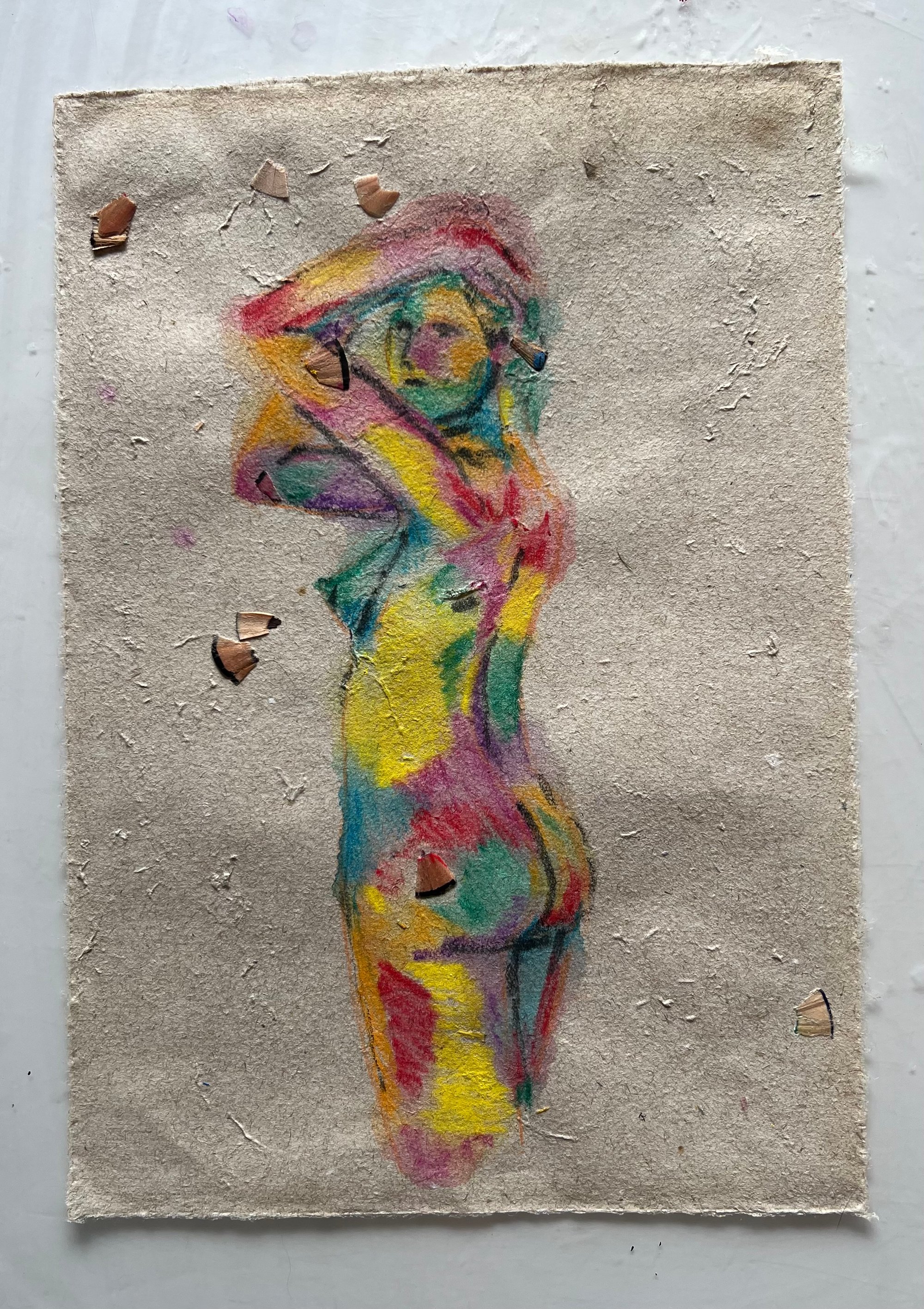 Handmade recycled paper crafted with pencil shavings and dried flowers, painted in watercolor and framed. This piece is a delicate ode to nature, intertwining organic textures with soft pigments to honor what is, perhaps, the most beautiful creation on earth — a woman. Her form, rendered in vibrant, flowing colors, carries both the strength and fragility of nature itself, capturing a sense of freedom, timelessness, and quiet vitality.
