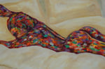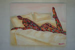 Acrylic on canvas, 30 x 40 inches (76 x 101.5 cm). A reclining woman painted in vibrant, multi-colored strokes, blending movement and stillness against the soft backdrop of cream-toned bedding.