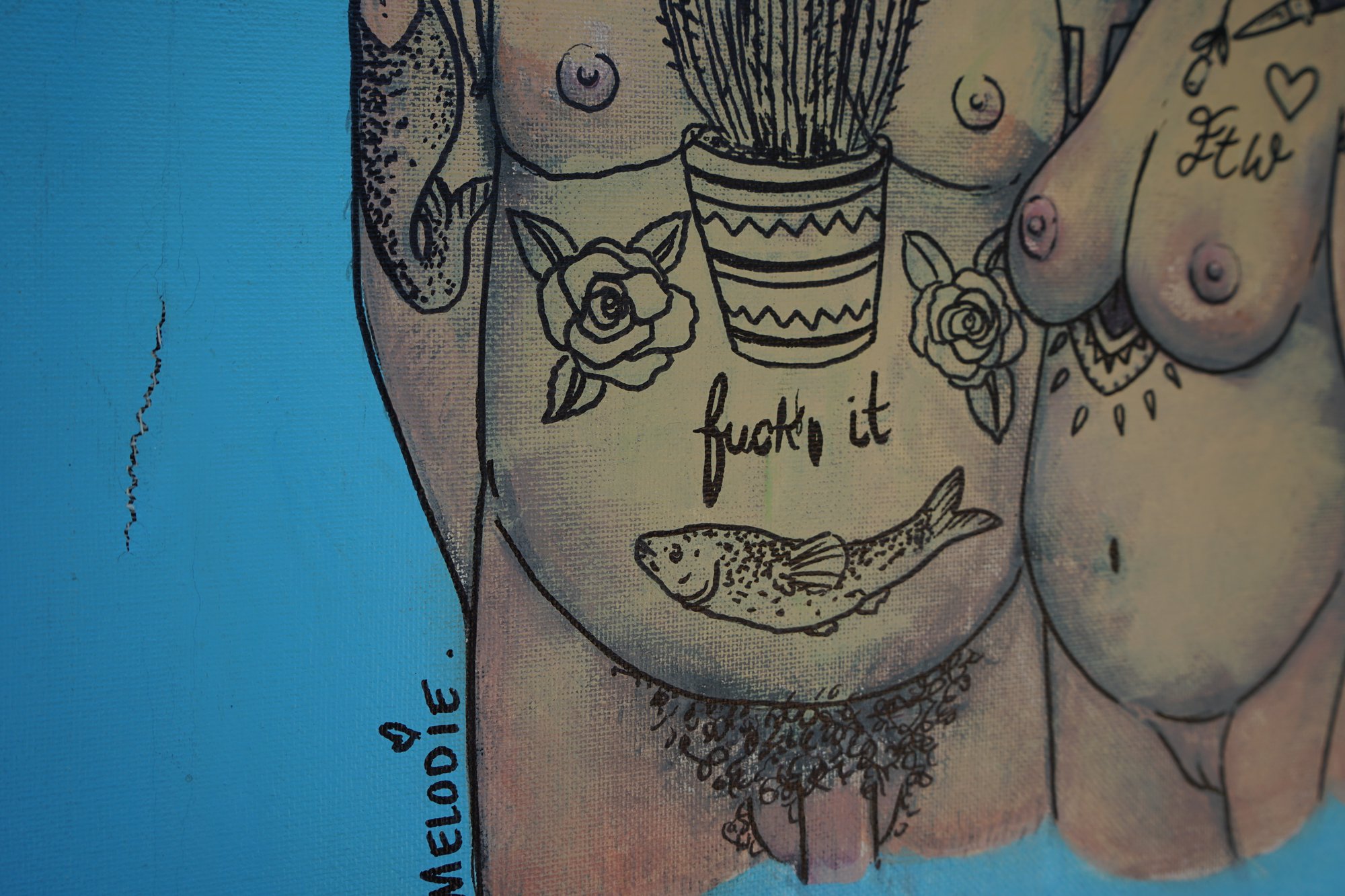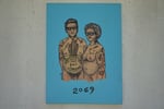 Acrylic on canvas, 18 x 24 inches (45.5 x 61 cm). 2069 or Us envisions an older couple in the future — unapologetic, body-positive, and fully themselves, adorned with tattoos and confidence against a bold blue backdrop. (Note: minor damage on the left side.)