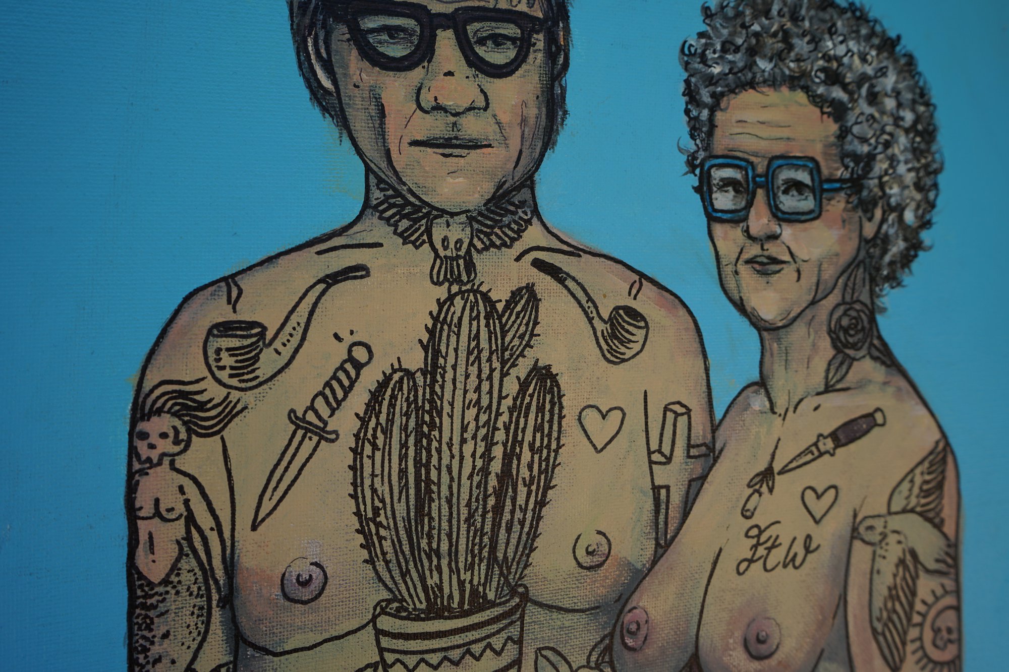 Acrylique sur toile, 18 x 24 pouces (45,5 x 61 cm). 2069 or Us imagine un couple plus âgé dans le futur — assumé, bien dans sa peau et pleinement lui-même, orné de tatouages et de confiance, sur un fond bleu éclatant. (Note : petit dommage sur le côté gauche.)