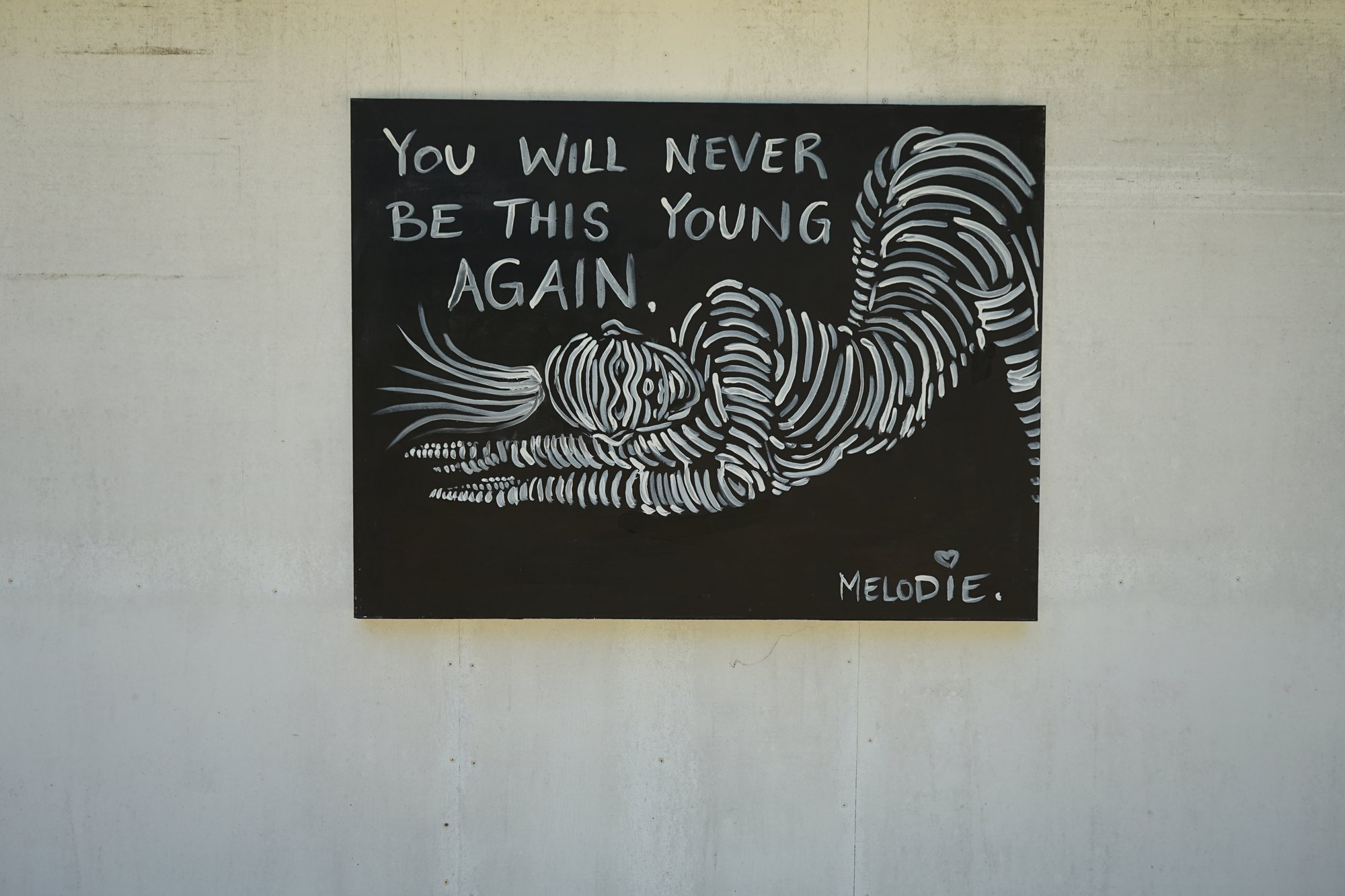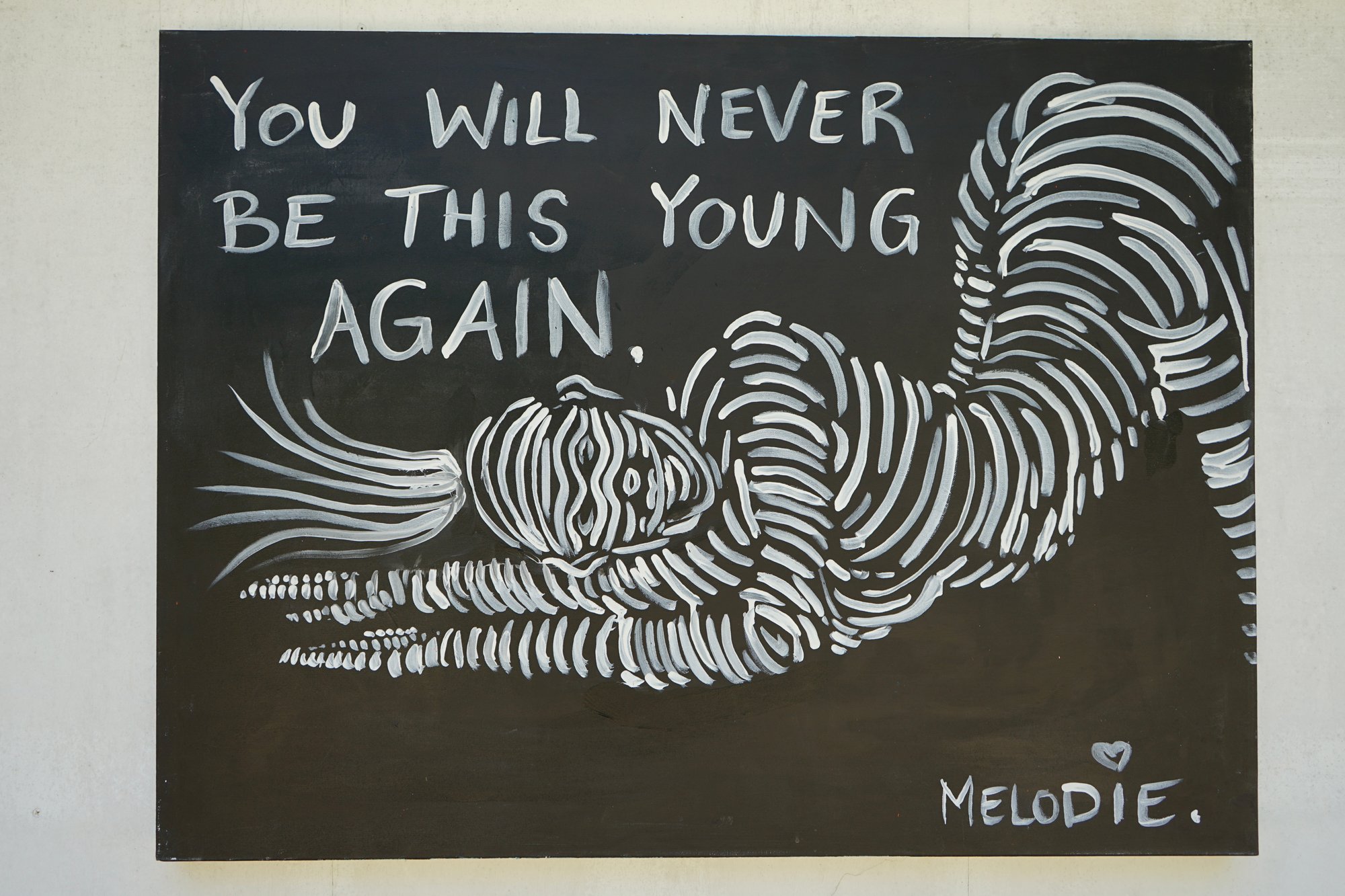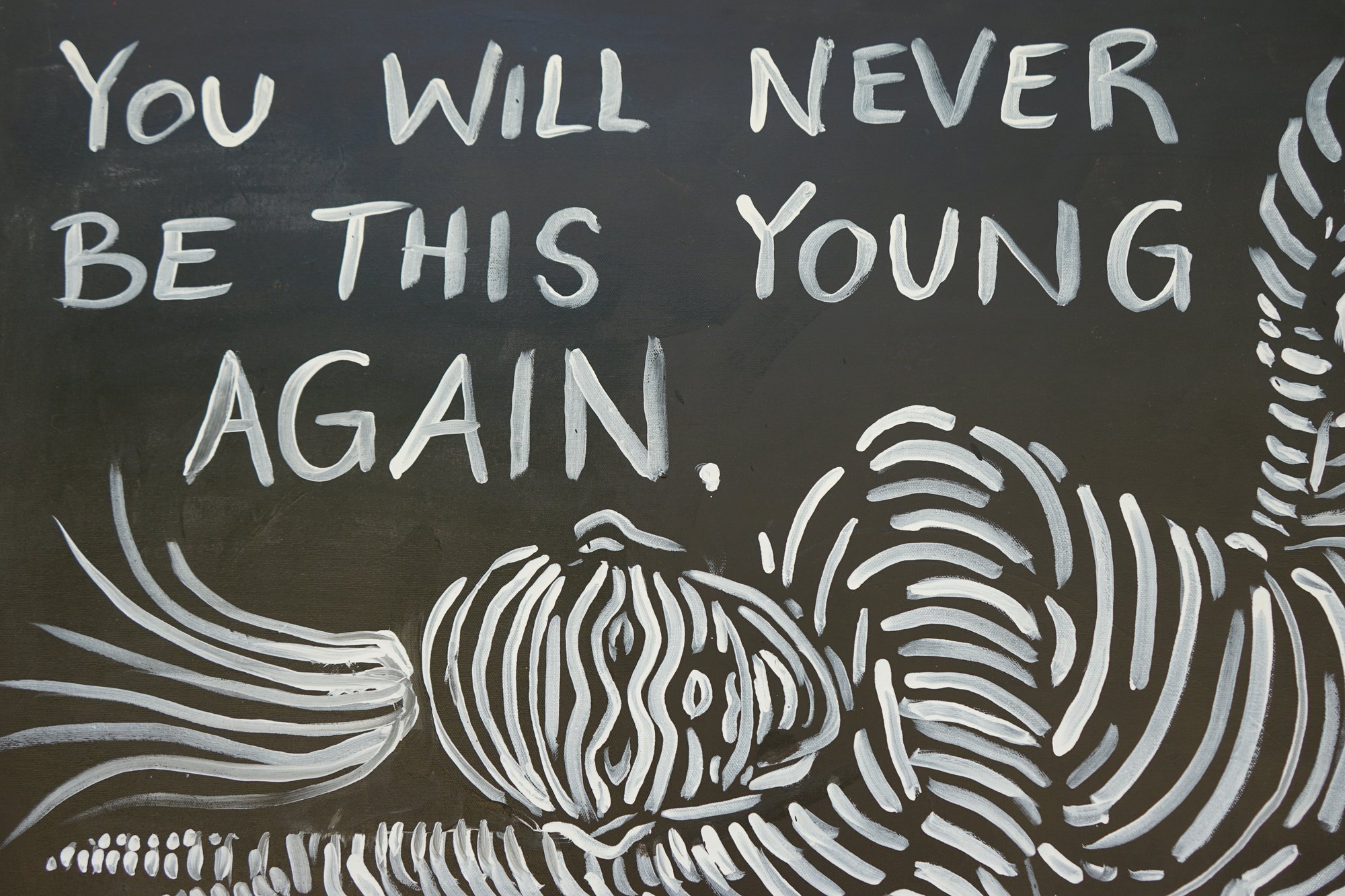 Acrylique sur toile, 30 x 40 pouces (76 x 101,5 cm). You will never be this young again, un doux rappel que le temps ne recule jamais, nous invitant à saisir les instants présents avant qu’ils ne s’effacent.